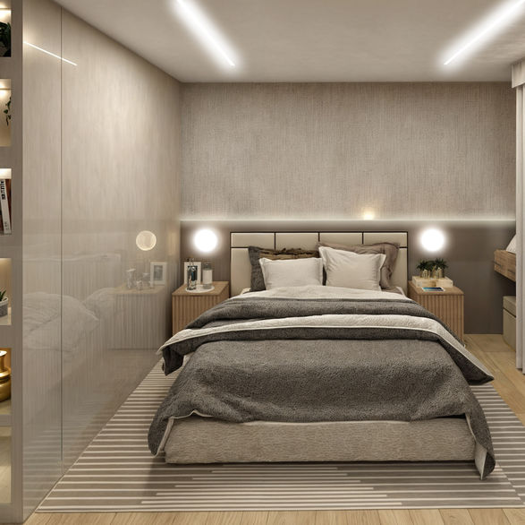 Os dormitórios também ganharam vida própria. O dormitório provençal se tornou um refúgio clássico e acolhedor, com cores suaves e uma estante de livros embutida para uma leitora voraz. O dormitório suíte foi otimizado ao máximo, com um closet divisória, um aparador de maquiagem e um cantinho especial para oração. Já o terceiro dormitório, ganhou um toque de cor e uma beliche planejada para aproveitar o espaço de forma inteligente. Cada detalhe foi pensado para criar um lar que fosse verdadeiramente único, que contasse a história da família.